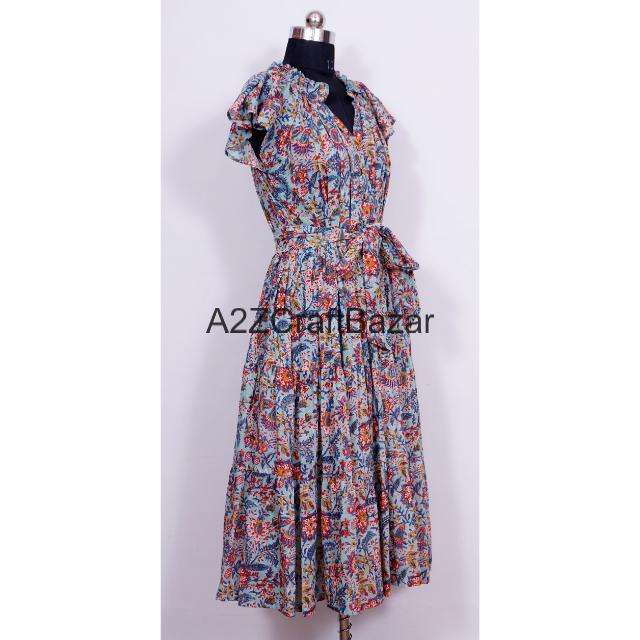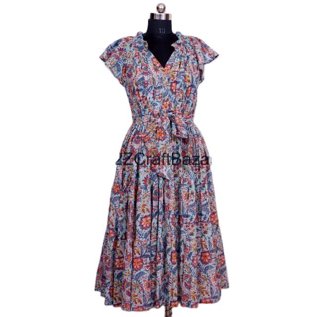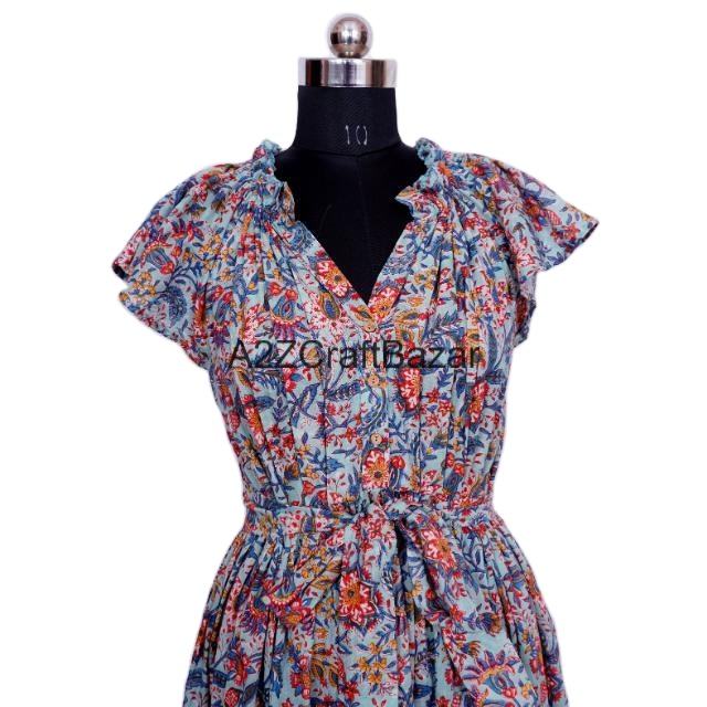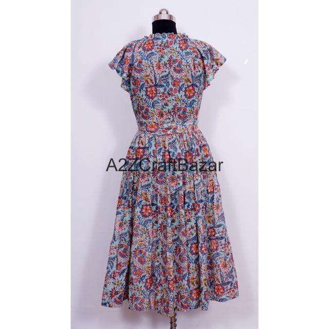 Indian Hand Block Printed Cotton Midi-Length Floral Print Long Dress Y2K Style Casual Party Wear Button Decoration Short Bodycon
