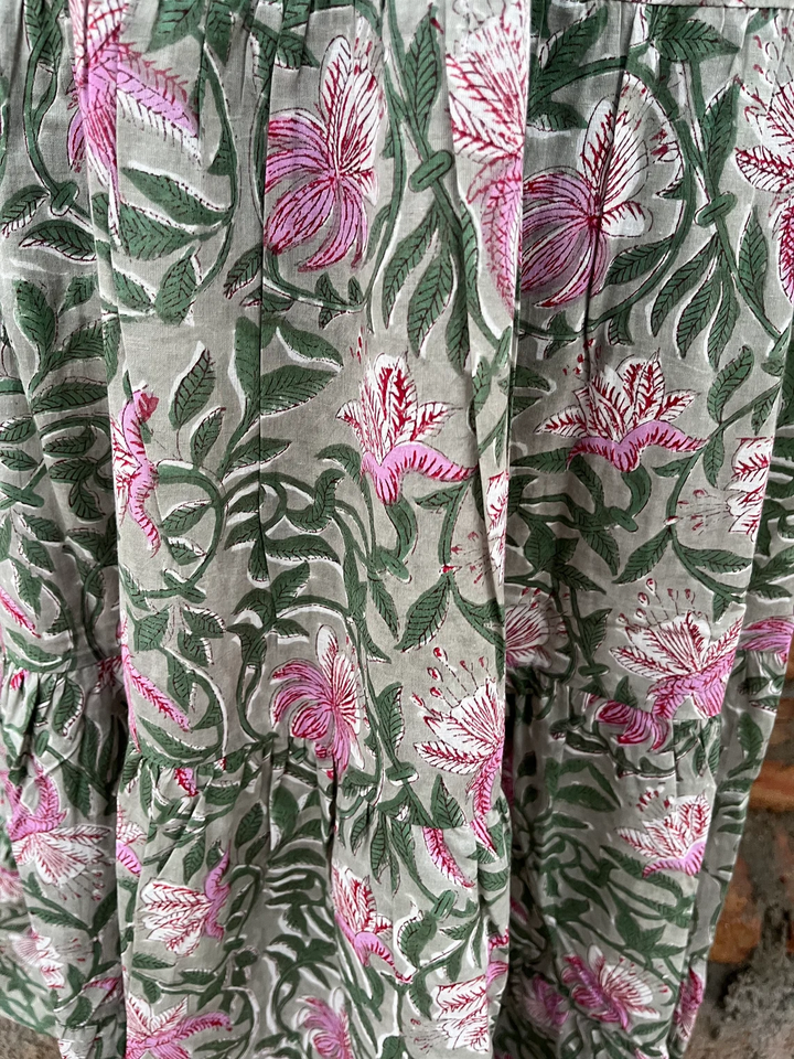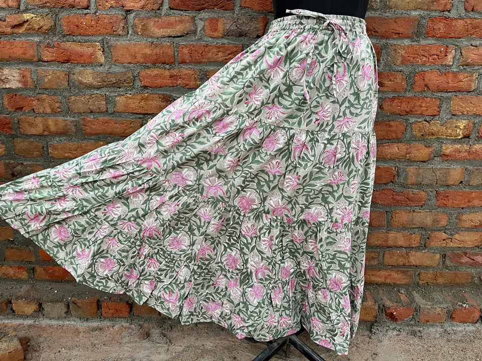 ชุดเดรสลำลองผ้าฝ้ายสีขาวพิมพ์ลายบล็อกอินเดียสำหรับผู้หญิง เอวยางยืด ระบายอากาศได้ดี กระโปรงยาว ราคาโรงงาน