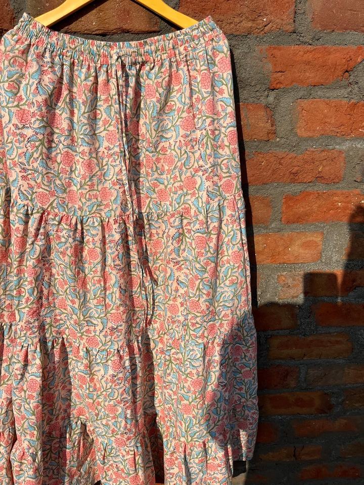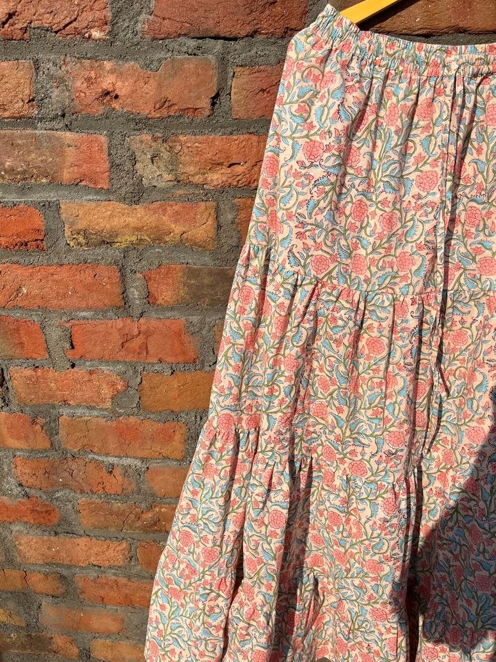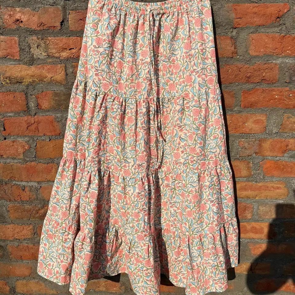 กระโปรงยาวผ้าฝ้ายสีขาวพิมพ์ลายบล็อกอินเดียสำหรับผู้หญิง สไตล์ลำลอง เอวยางยืด ระบายอากาศได้ดี