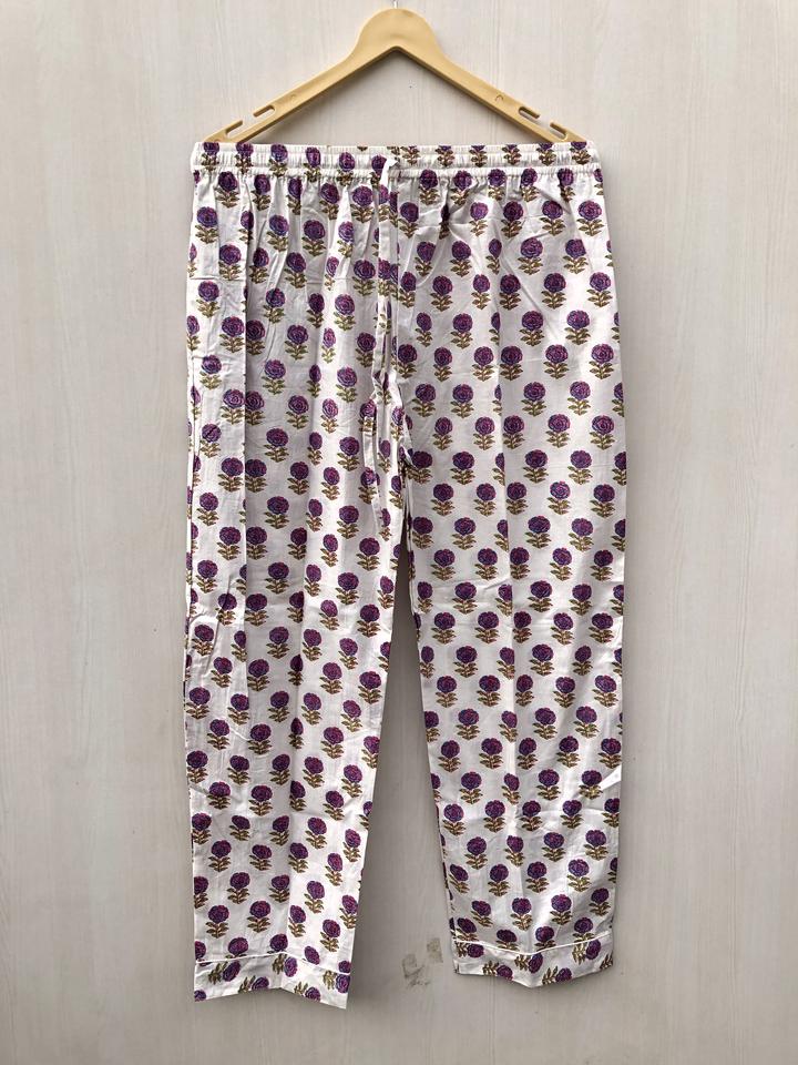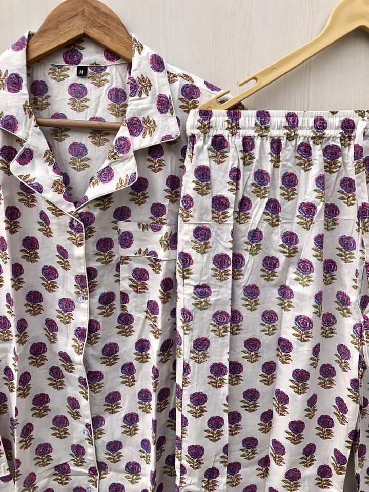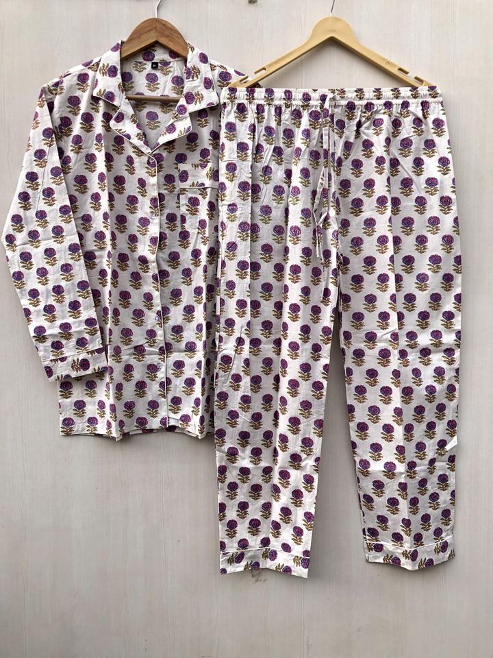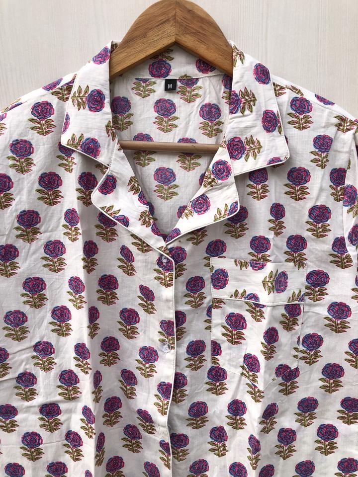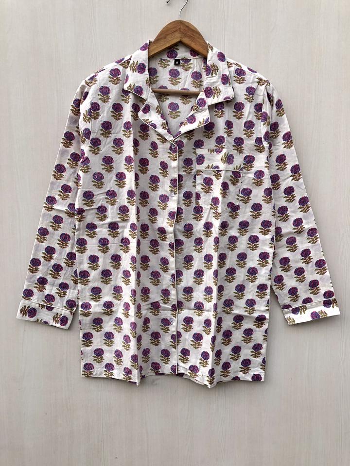 ชุดนอนพิมพ์ลายบล็อกอินเดีย ชุดนอนลายดอกไม้ ชุดนอนทำมือ ของขวัญคริสต์มาสสำหรับเธอ