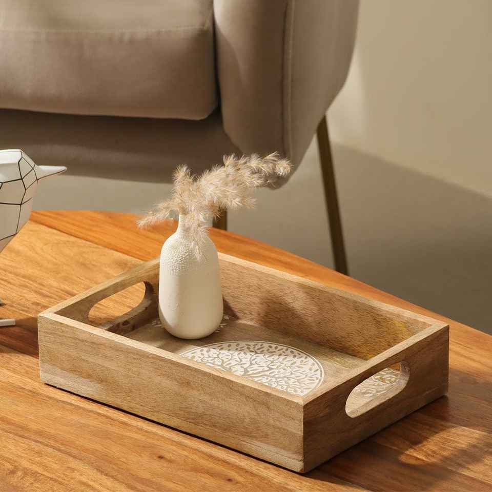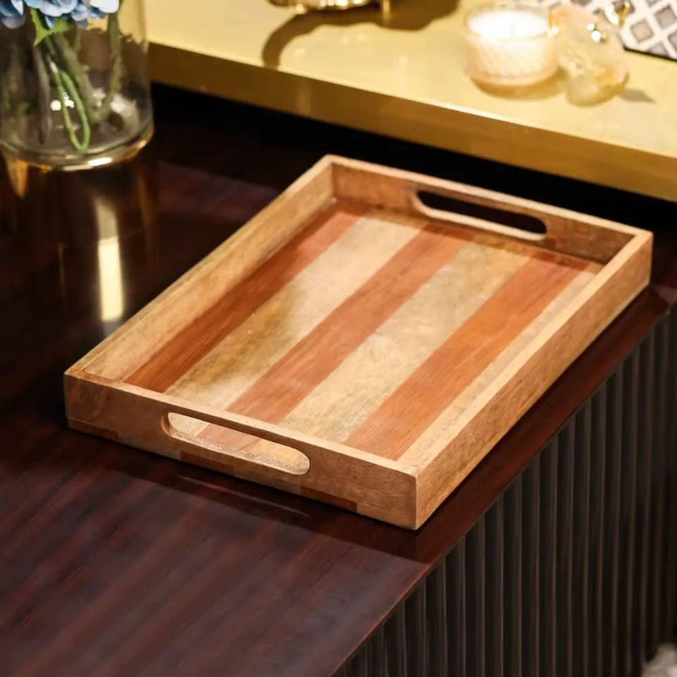 ถาดเสิร์ฟไม้ทำมือจากอินเดีย เป็นมิตรกับสิ่งแวดล้อม ทันสมัย ทนทาน เหมาะสำหรับอาหารเช้า ชา และกาแฟ นำเข้าจากอินเดีย