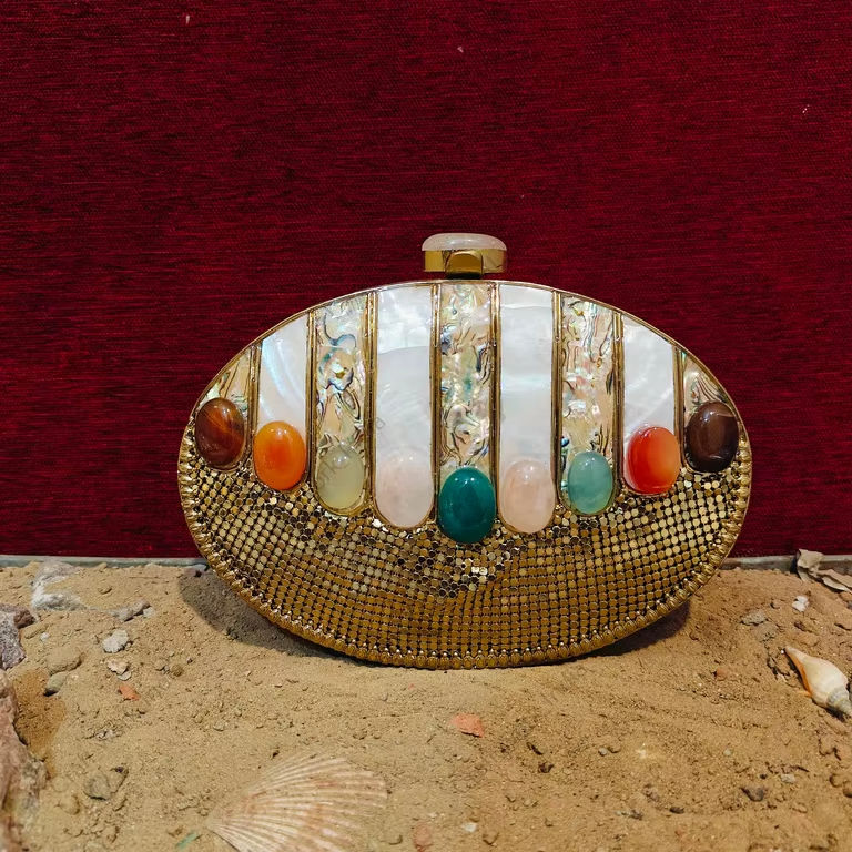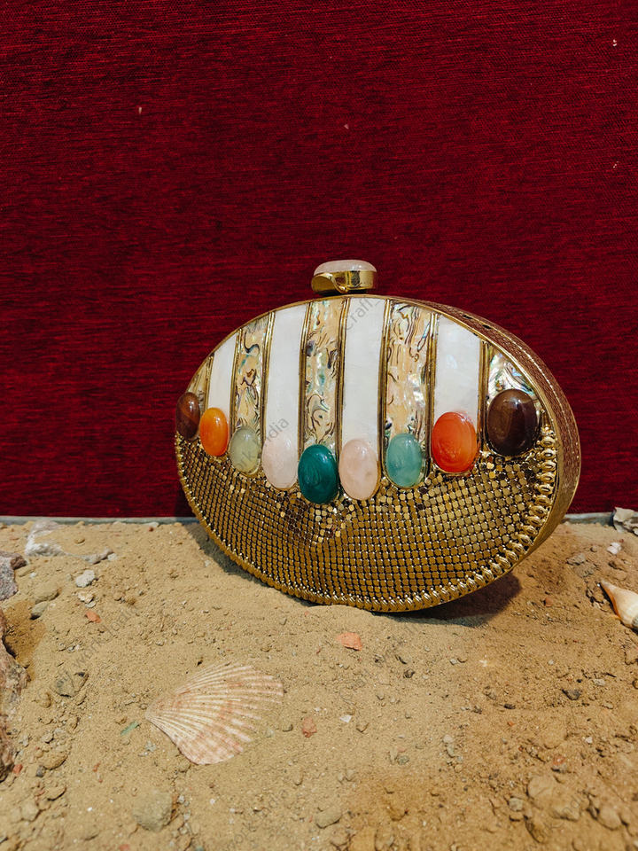 กระเป๋าคลัทช์ทองเหลืองประดับมุกเปลือกหอยทำมือจากอินเดีย พร้อมหินอาเกตธรรมชาติ สำหรับงานเลี้ยงกลางคืนหรืองานแต่งงานสุดหรู