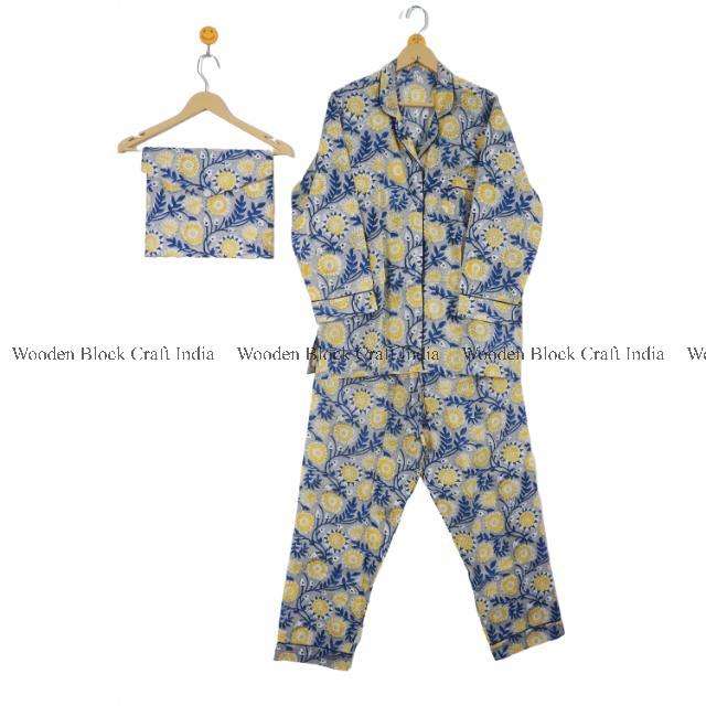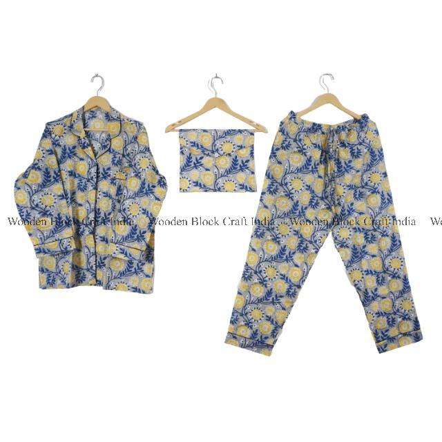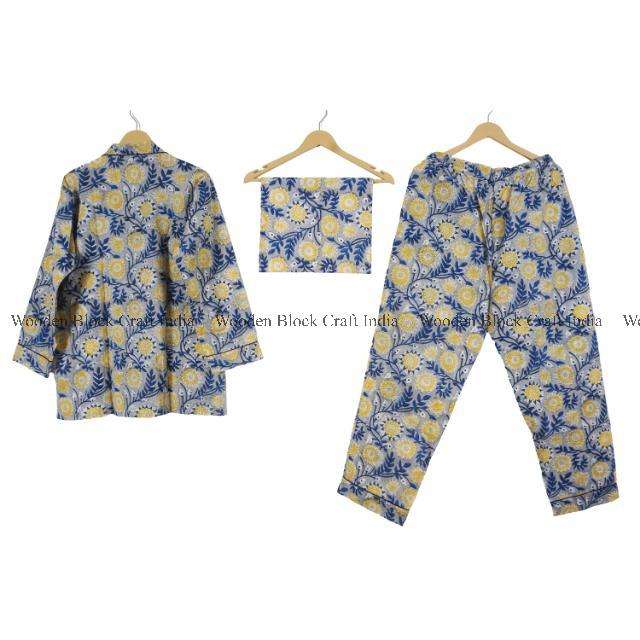 ชุดนอนผ้าฝ้ายทำมือจากอินเดีย 100% ลายดอกไม้ กางเกงขายาวและเสื้อเชิ้ต ชุดนอนสำหรับผู้ชายและผู้หญิง กางเกงขาสั้นสำหรับใส่ในบ้าน ชุดนอนฤดูร้อน