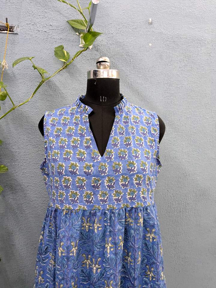 ชุดเดรสยาวผ้าฝ้ายพิมพ์ลายบล็อกทำมือสไตล์อินเดียสำหรับผู้หญิง ชุดลำลองสไตล์โบฮีเมียน แขนกุด มีกระเป๋าข้างสองข้าง ดีไซน์หวานละมุนแบบธรรมชาติ