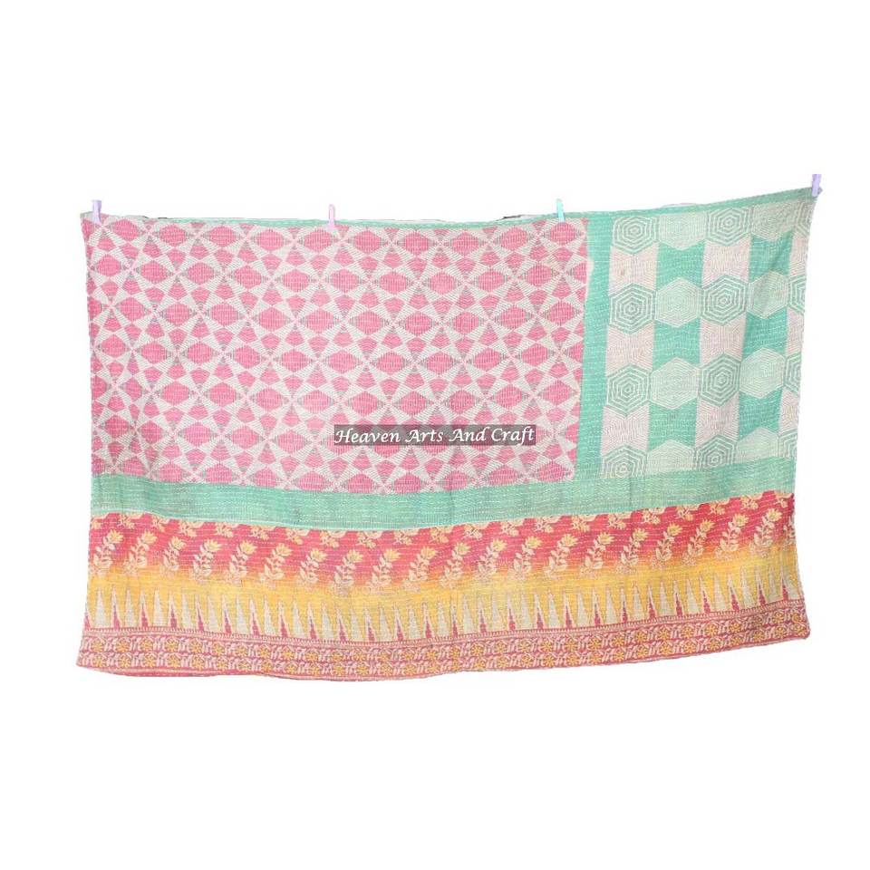 ผ้าห่มคันธาพิมพ์ลายบล็อกทำมือจากอินเดีย ชุดเครื่องนอน ผ้าคลุมเตียง ผ้าห่มทอมือแบบสองด้าน ผ้าห่มหนานุ่มจากผ้าส่าหรีเก่า