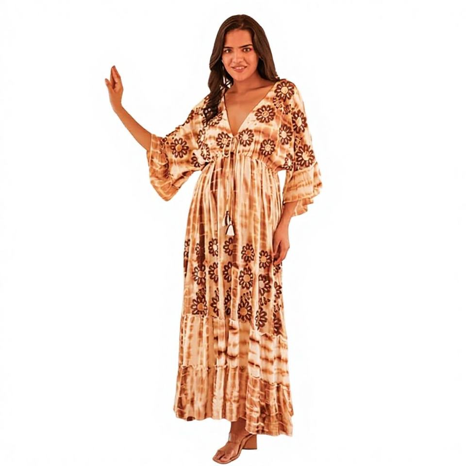 ชุดเดรสผ้าฝ้ายพิมพ์ลายดิจิทัลสไตล์โบฮีเมียนทรงเอไลน์แบบมิดิ ทำมือจากอินเดีย เหมาะสำหรับใส่ไปเที่ยวทะเลหรือรีสอร์ทในช่วงฤดูร้อน