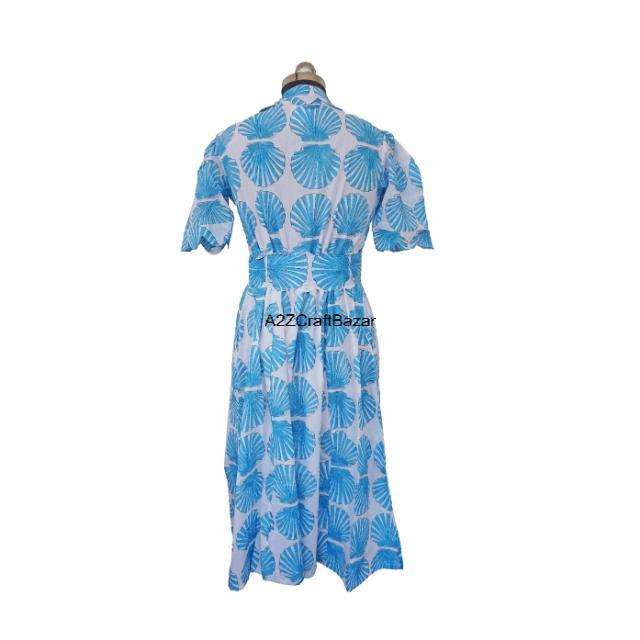 เดรสผ้าฝ้ายธรรมชาติ 100% ทำมือจากอินเดีย สีฟ้าอ่อน ลายดอกไม้สไตล์วินเทจ ทรงหลวม ความยาวปานกลาง คอวี พร้อมเข็มขัด ลายพิมพ์บล็อก แขนสั้น