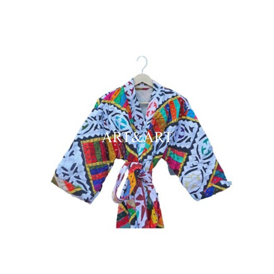 ชุดกิโมโนสั้นผ้าฝ้ายสไตล์โบฮีเมียนทำมือจากอินเดียสำหรับผู้หญิง ชุดชายหาดหรูหรา ชุดนอน คอวี ยาวระดับเข่า มีเข็มขัดผูกด้านหน้า