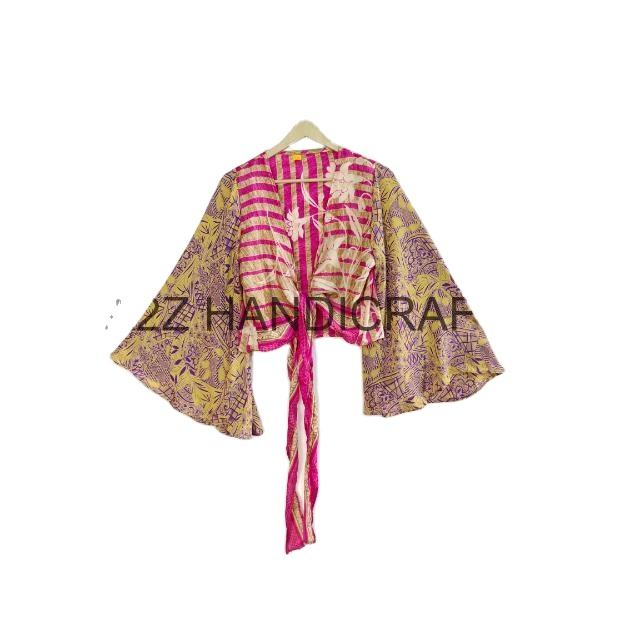 Indian Handmade Boho Hippie Front Tie Summer Top Bell Sleeve Top Women Silk Tie Wrap Sexy Top Leg-of-mutton Sleeve Dress