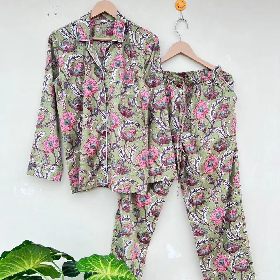 ชุดนอนผ้าป๊อปลินผ้าฝ้ายแท้ 100% ทำมือจากอินเดีย ลายดอกไม้หรูหรา สไตล์ลำลอง สำหรับฤดูใบไม้ผลิ ฤดูร้อน ฤดูใบไม้ร่วง รับผลิตแบบ ODM