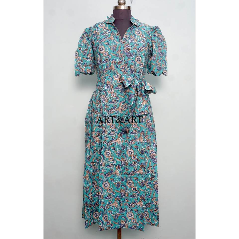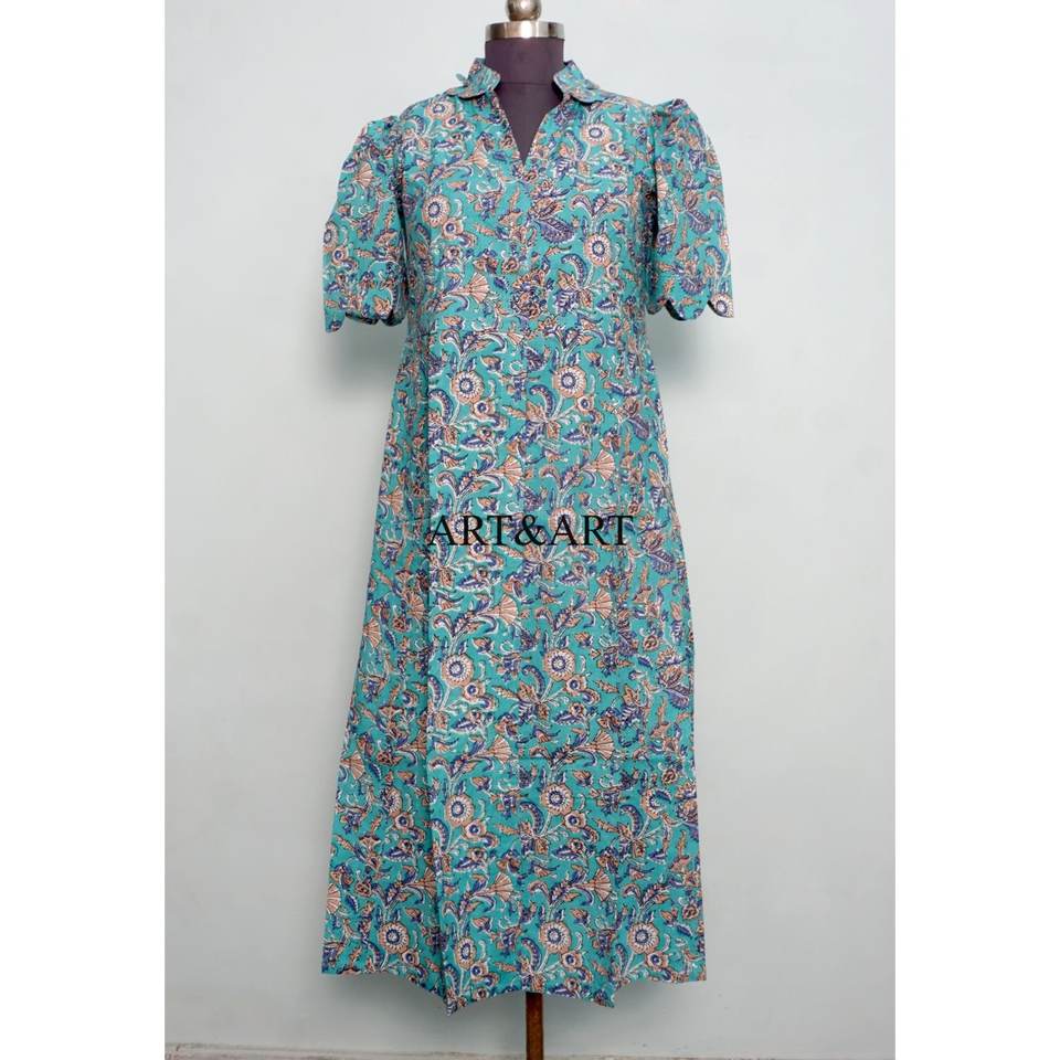 ชุดเดรสผ้าฝ้ายทำมือสไตล์อินเดีย ลายพิมพ์ดอกไม้แบบบล็อกพิมพ์ด้วยมือ น่ารัก หวาน ใส่ได้ทุกวัน ใส่ไปงานปาร์ตี้ได้ ทรงเอไลน์