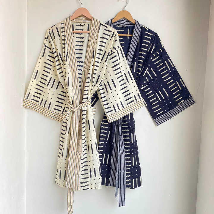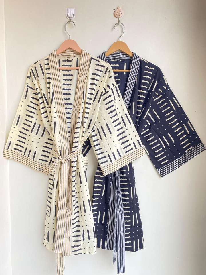 ชุดกิโมโนผ้าฝ้ายทำด้วยมือสไตล์อินเดีย, ชุดใส่อยู่บ้านสไตล์โบฮีเมียนเสื้อคลุมอาบน้ำน้ำหนักเบาชุดแต่งตัวพิมพ์ลายแบบบล็อกชุดกิโมโนผ้าฝ้ายเนื้อนุ่มของขวัญสำหรับผู้หญิง