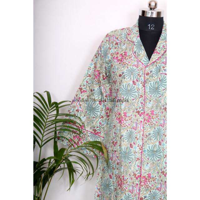 ชุดกิโมโนผ้าฝ้ายทำมือจากอินเดียสำหรับผู้หญิง เสื้อเชิ้ตตัวยาวพร้อมสายผูกเอว ตกแต่งกระดุมแบบพัน ผ้าคลุมไหล่สไตล์ชาติพันธุ์สำหรับใส่พักผ่อนหรือคลุมชุดไปทะเล