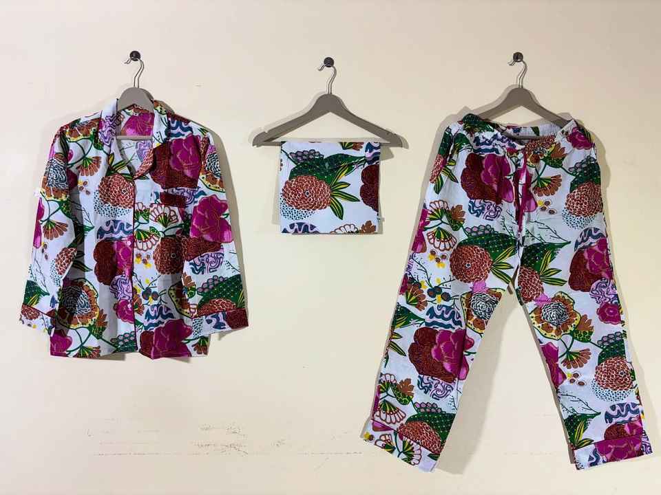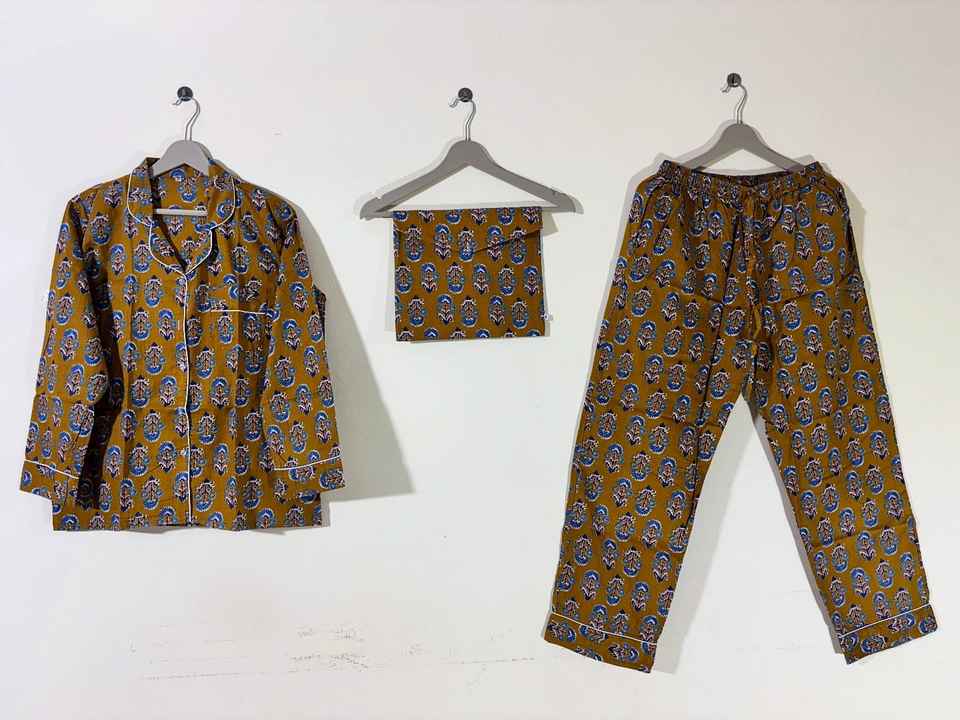 ชุดนอนผ้าฝ้ายทำมือจากอินเดีย ชุดนอนผ้าฝ้ายเนื้อนุ่ม ชุดนอนลายพิมพ์บล็อกมือ ลายดอกไม้แบบชาวชาวรุรุปุรี ชุดลำลอง
