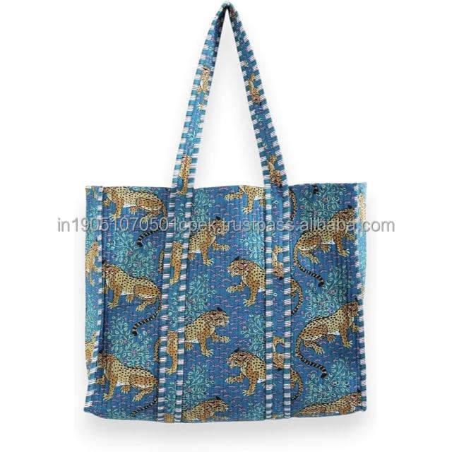กระเป๋าสะพายไหล่ผ้าฝ้ายพิมพ์ลายเสือดาวขนาดใหญ่สำหรับผู้หญิงสีฟ้า