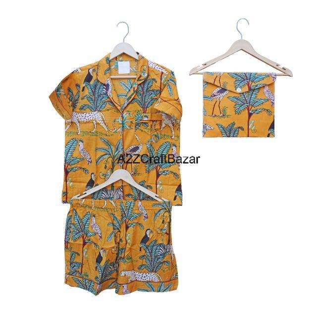 ชุดนอนสตรีแขนสั้นใส่สบายพิมพ์ลายดอกไม้ป่าแขนสั้นงานแฮนด์เมดผ้าฝ้ายอินเดีย