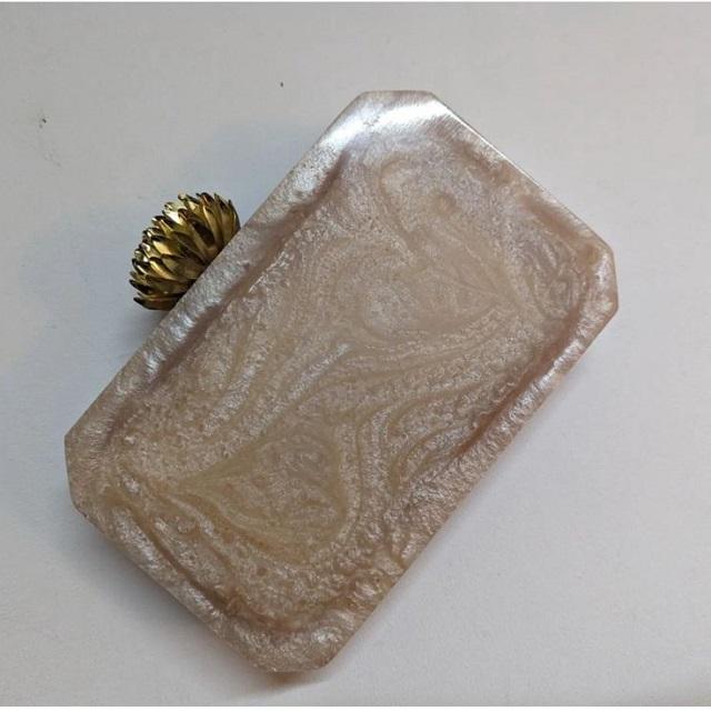 อินเดียแฮนด์เมดโลโก้ที่กําหนดเองกระเป๋าสุภาพสตรีออกแบบใหม่ราคาขายส่งแฮนด์เมดเรซิ่นกระเป๋าพรรคสําหรับวาดแฟชั่นคลัทช์