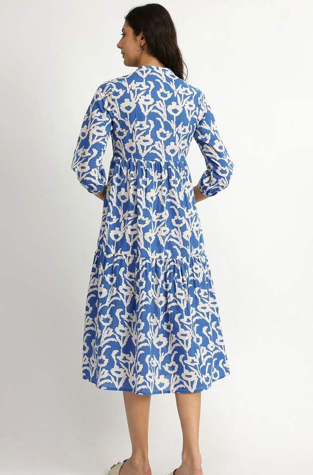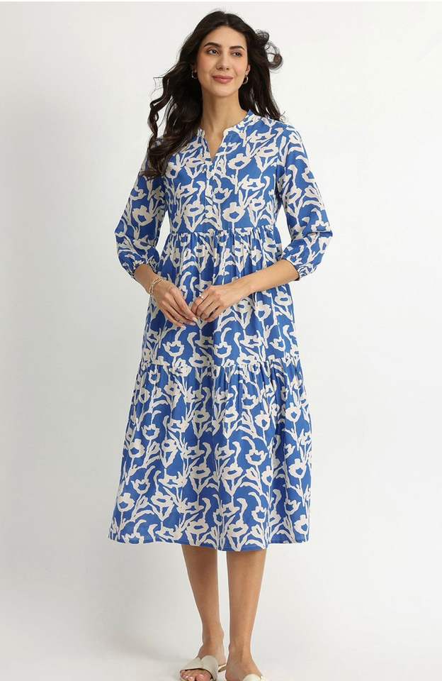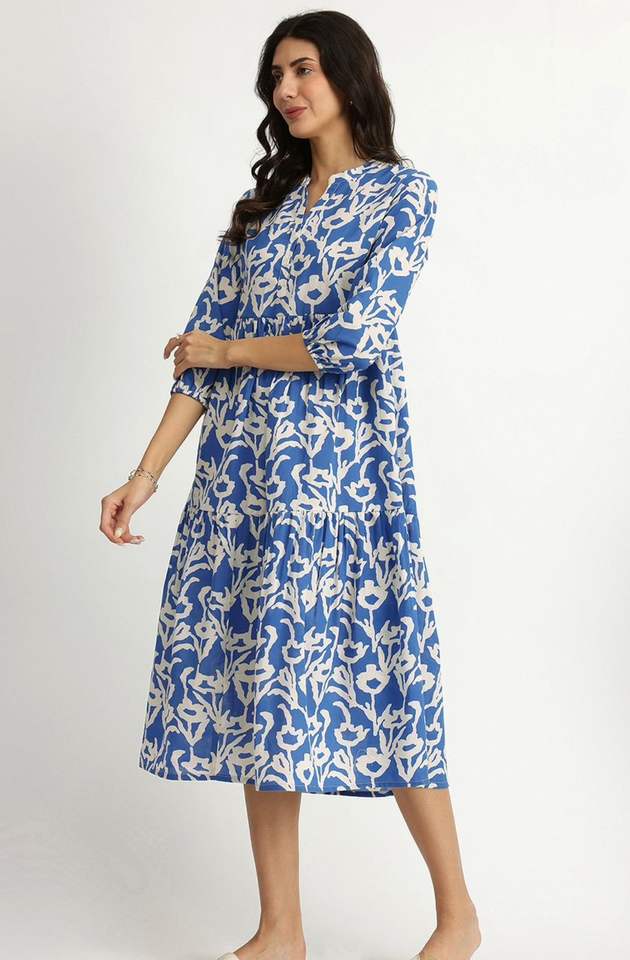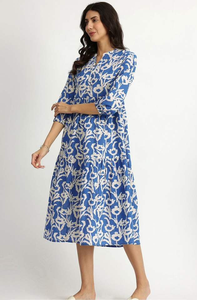 ชุดเดรสยาวผ้าฝ้ายพิมพ์ลายดอกไม้สำหรับผู้หญิงงานปาร์ตี้ทำด้วยมือจากนักออกแบบชาวอินเดีย