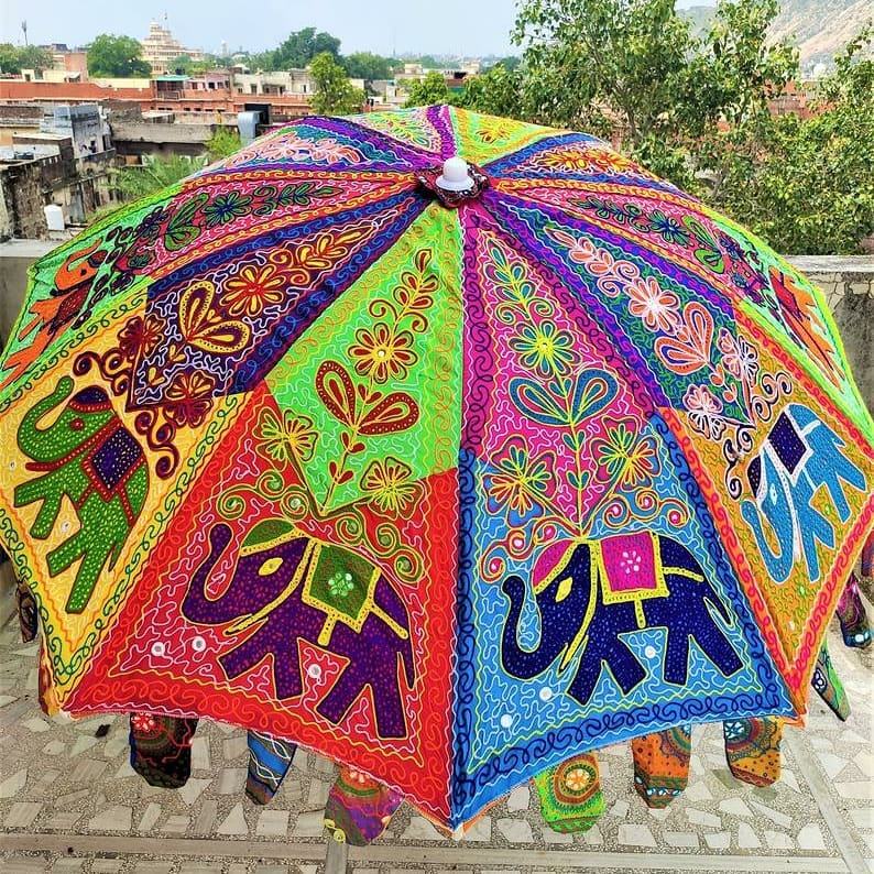 ร่มพับลายมันดาลาปักลายช้างแบบอินเดียทำมือจากผ้าฝ้าย โครงโลหะ สำหรับใช้กลางแจ้ง ชายหาด สวน