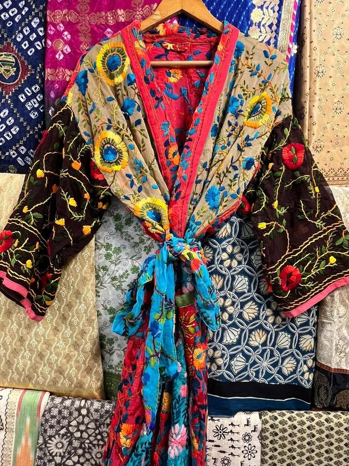 เสื้อคลุมกิโมโนแจ็กเก็ตยาวแขนยาวผ้าไหมพูลคาริปักลายแฮนด์เมดแนวอินเดียนชุดคลุมบิกินี่ชายหาด
