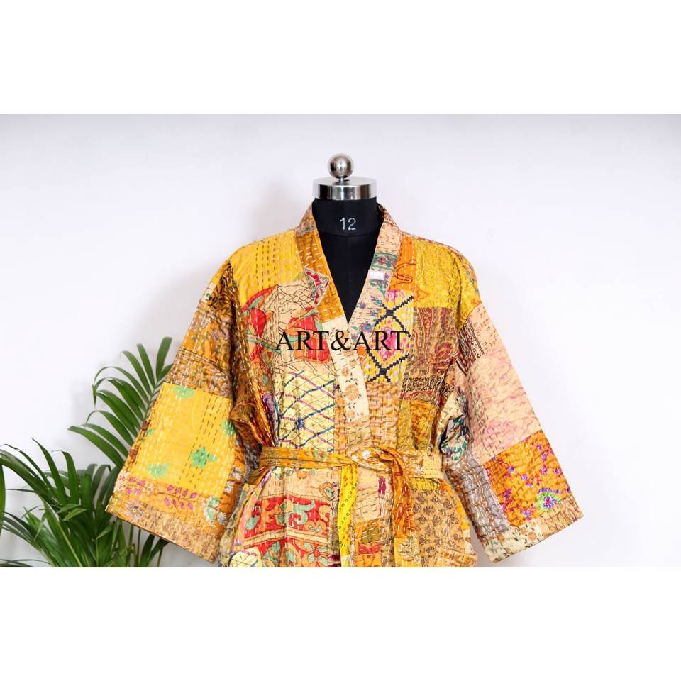 ชุดกิโมโนผ้าไหม/ผ้าฝ้ายคันธาทำมือจากอินเดีย สำหรับผู้หญิง ลายปะติดปะต่อ ระบายอากาศได้ดี นุ่มสบาย เหมาะสำหรับฤดูร้อน ความยาวคลุมเข่า
