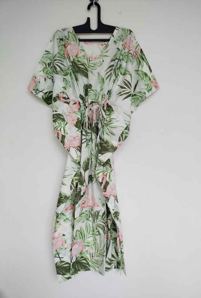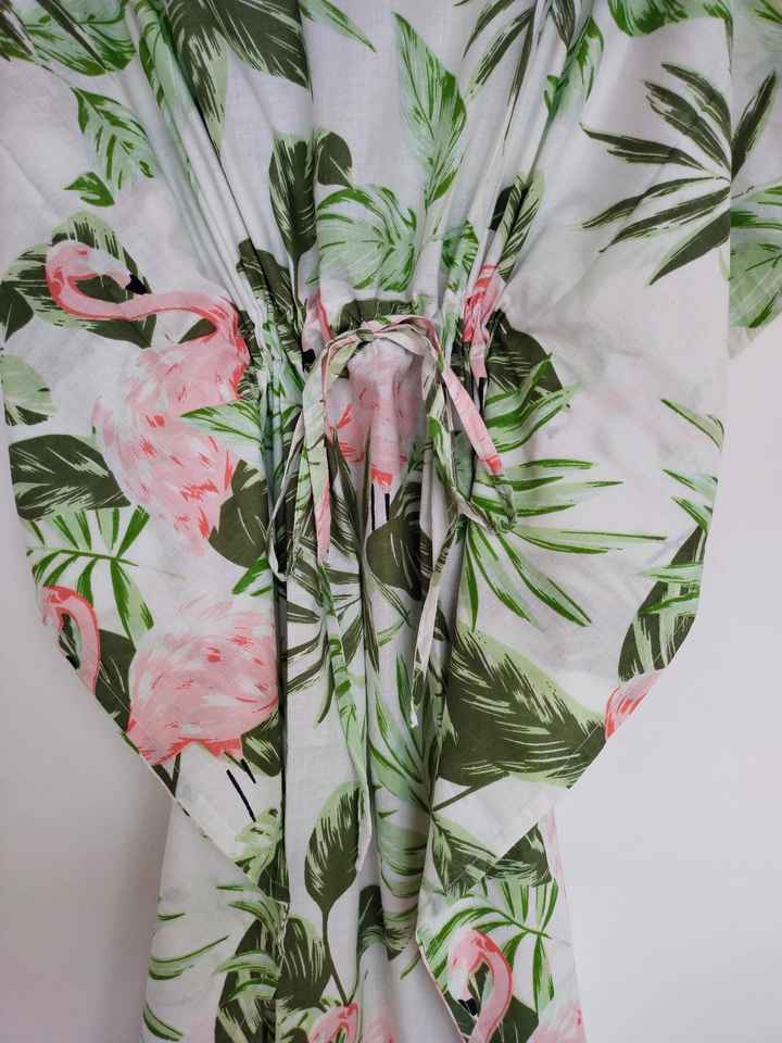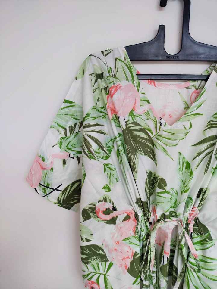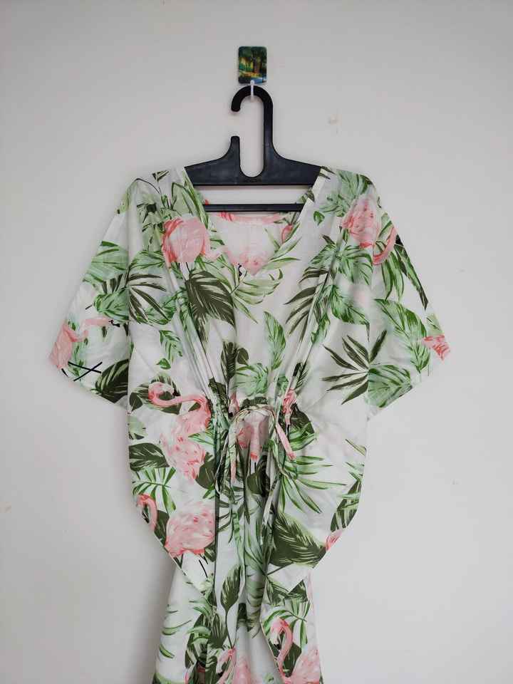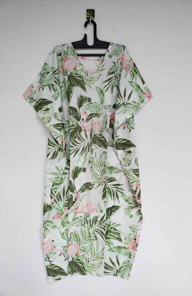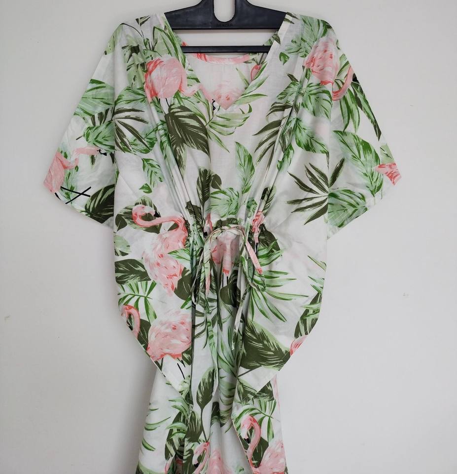 ชุดเดรสคาฟทันผ้าฝ้ายพิมพ์ลายดอกไม้สไตล์วินเทจทำมือจากอินเดีย ทรงเอ คอวี แขนสามส่วน ความยาวระดับเข่า เหมาะสำหรับใส่ไปชายหาด