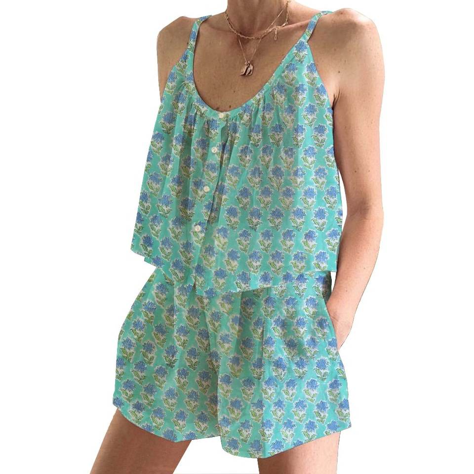 ชุดนอนขาสั้นผ้าฝ้ายพิมพ์ลายบล็อกวินเทจทำมือจากอินเดีย ชุดนอนสายเดี่ยวลายดอกไม้สำหรับฤดูใบไม้ผลิ/ฤดูร้อน