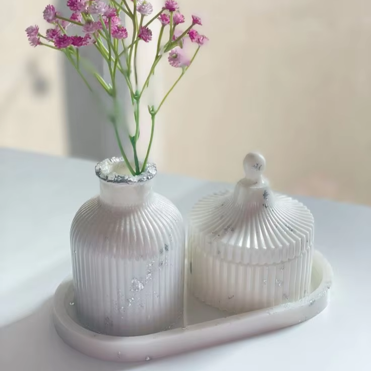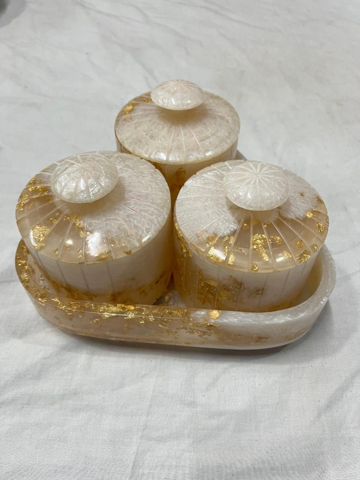 ชุดกระปุกและภาชนะเรซิ่นมุกสีขาวทำมือจากอินเดีย ชุดห้าชิ้น ใช้ในครัว ราคาถูก ขายส่ง ส่งออก