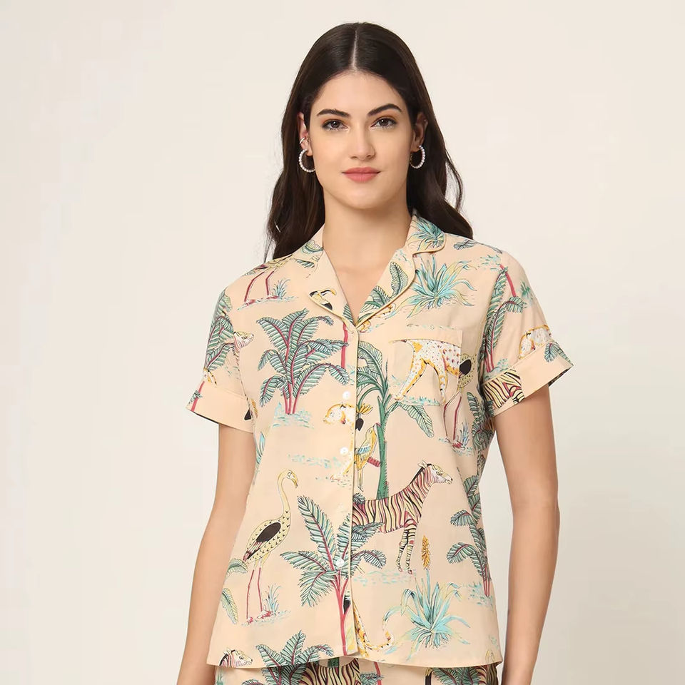 ชุดนอนผ้าฝ้ายพิมพ์ลายดอกไม้ แขนสั้น คอวี สำหรับผู้หญิง ทำมือจากอินเดีย 100% ผ้าฝ้าย นุ่มสบาย ระบายอากาศได้ดี ชุดนอนลำลอง