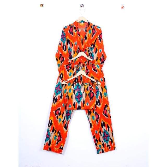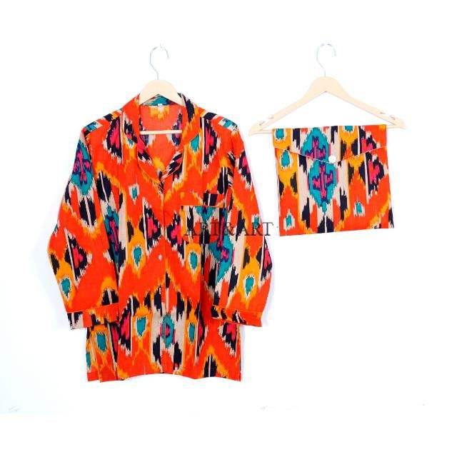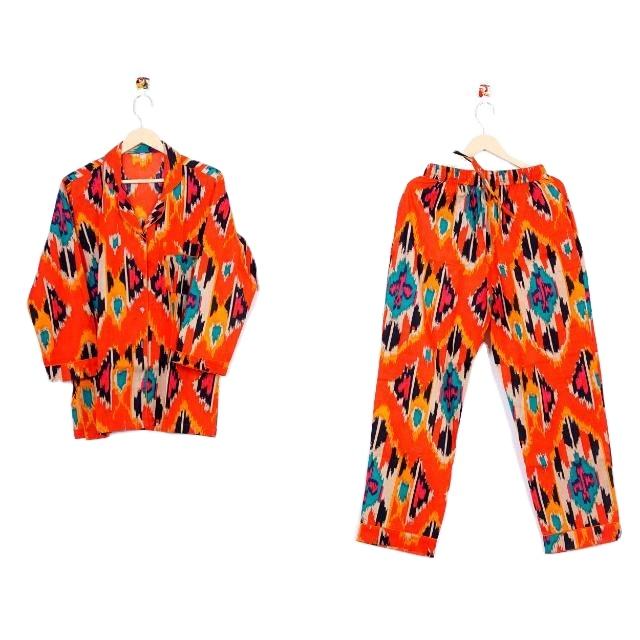 ชุดนอนผู้หญิงลายดอกไม้พิมพ์ลายสวยงาม แขนยาว คอวี ผ้าฝ้ายแท้ 100% ผลิตด้วยมือจากอินเดีย เนื้อผ้านุ่ม ระบายอากาศได้ดี แห้งเร็ว สวมใส่สบาย