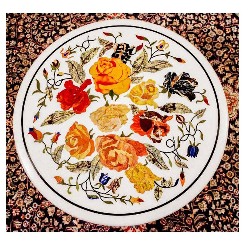 Indian Manufacture White Marble Flower Inlay Work Coffee Table Top