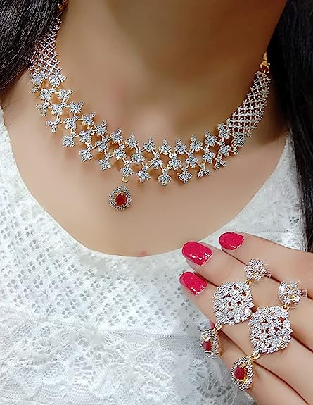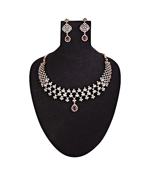 ชุดเครื่องประดับทองคุณภาพสูงแบบอินเดียต่างหูประดับเพชรสังเคราะห์สีแดงเข้มแบบคลาสสิกชุดเครื่องประดับสำหรับงานปาร์ตี้เพทาย