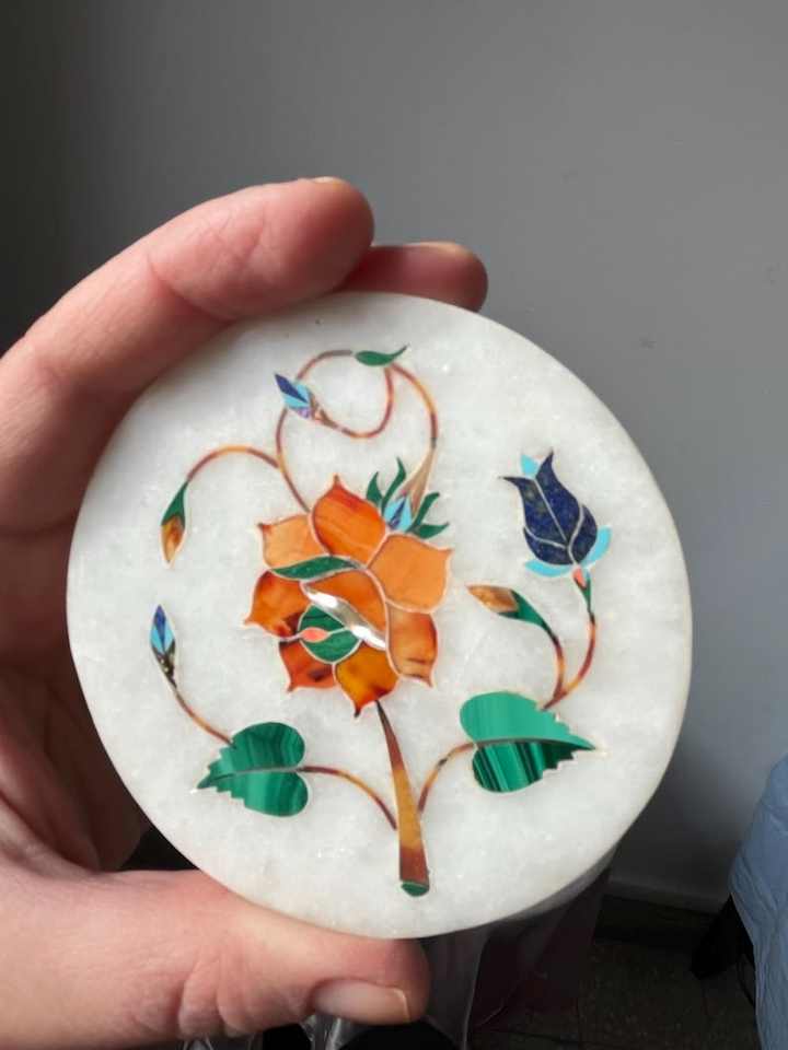 ชุดจานรองแก้วหินอ่อนอินเดียฝังมุกมาลาไคต์ ลาพิส ลาซูลี และเปลือกหอยมุก ทำด้วยมือ 6 ชิ้น พร้อมที่วาง