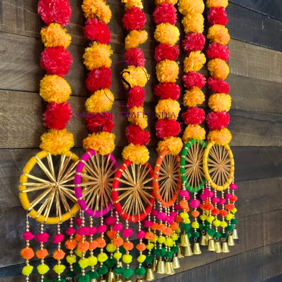 ดอกไม้ประดิษฐ์แขวนประตูแบบอินเดียหลากสีพร้อมเชือกดอกดาวเรืองสำหรับตกแต่งฉากหลังงานแต่งงานที่แขวนอยู่ที่ระเบียง