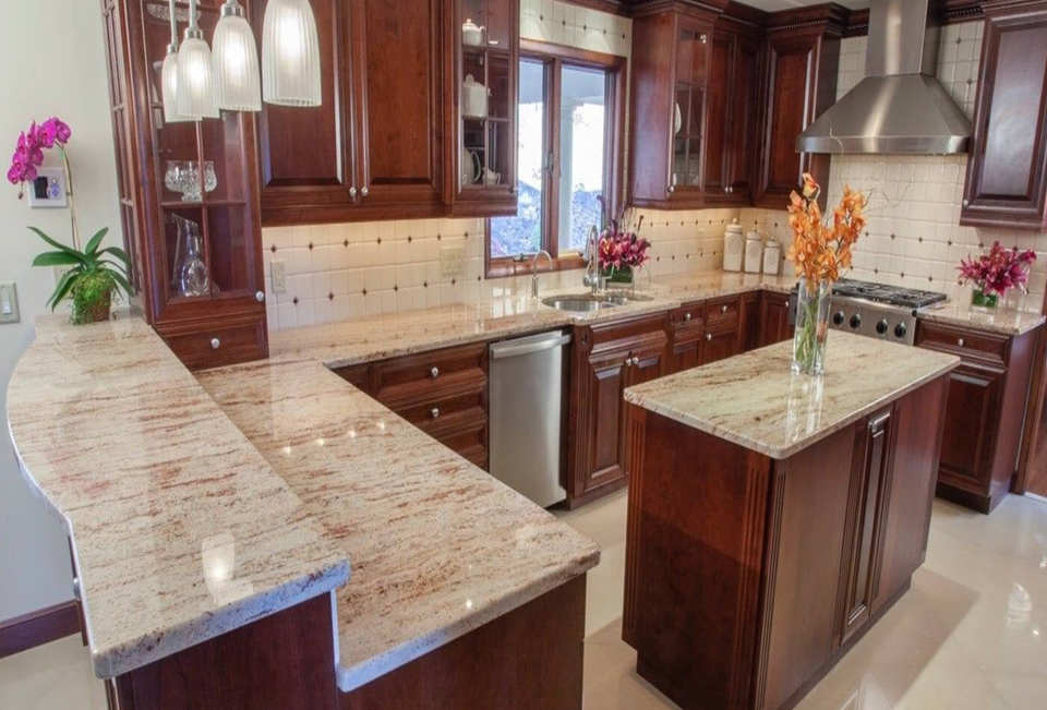 แผ่นหินแกรนิตสีเบจธรรมชาติของอินเดียแผ่นหินแกรนิตสีชมพูงาช้างคุณภาพดีที่สุดเคาน์เตอร์ทันสมัยพื้นสำหรับห้องครัวกลางแจ้ง