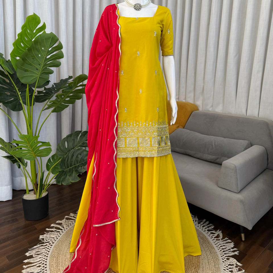 ชุดชาราร่าผ้าไหมครีปสีเหลืองสวยหรูสไตล์อินเดีย-ปากีสถาน ชุดชาราร่าแบบหนักแน่นสำหรับงานปาร์ตี้และงานแต่งงานสำหรับผู้หญิง