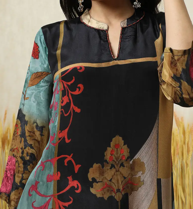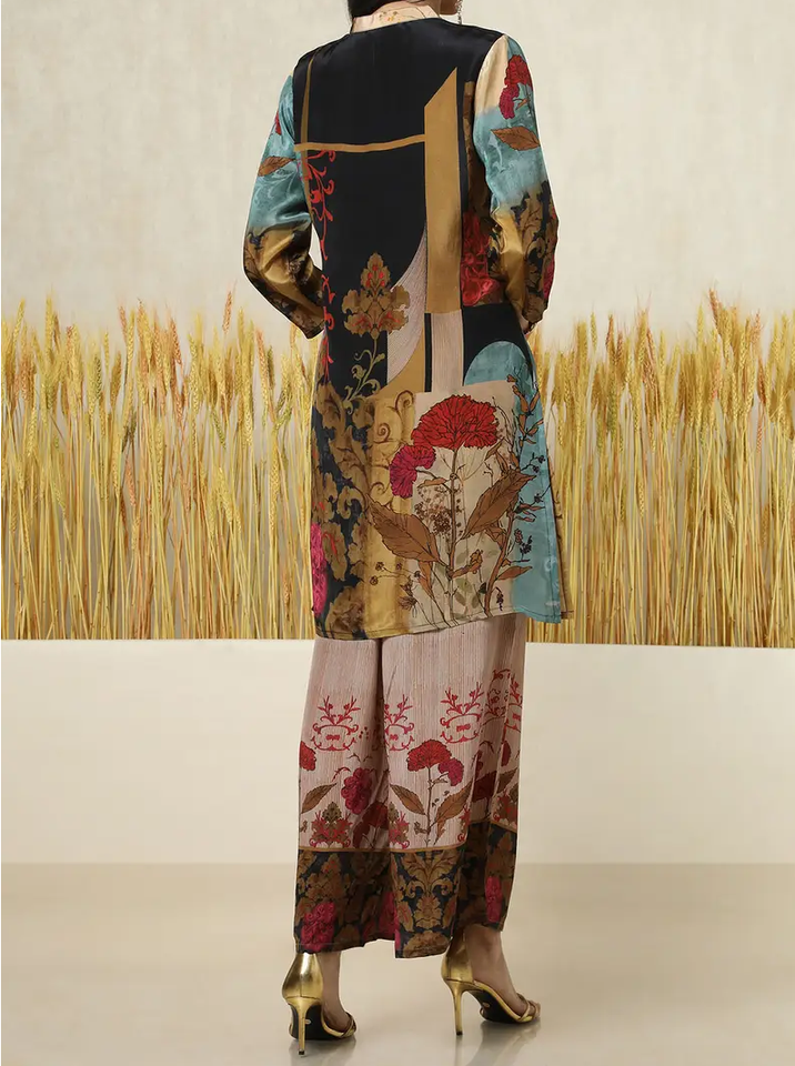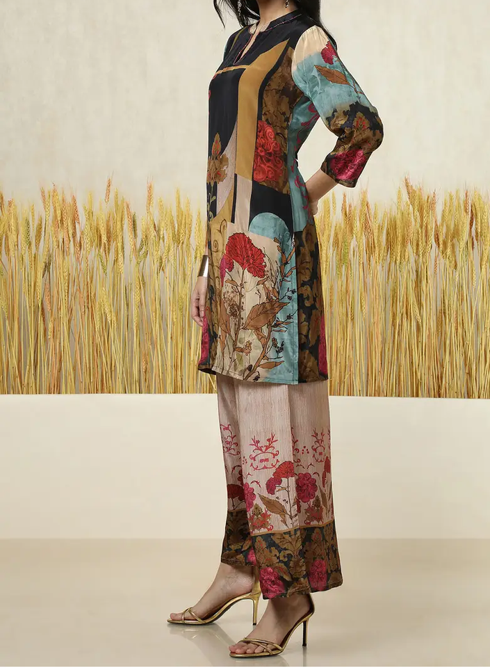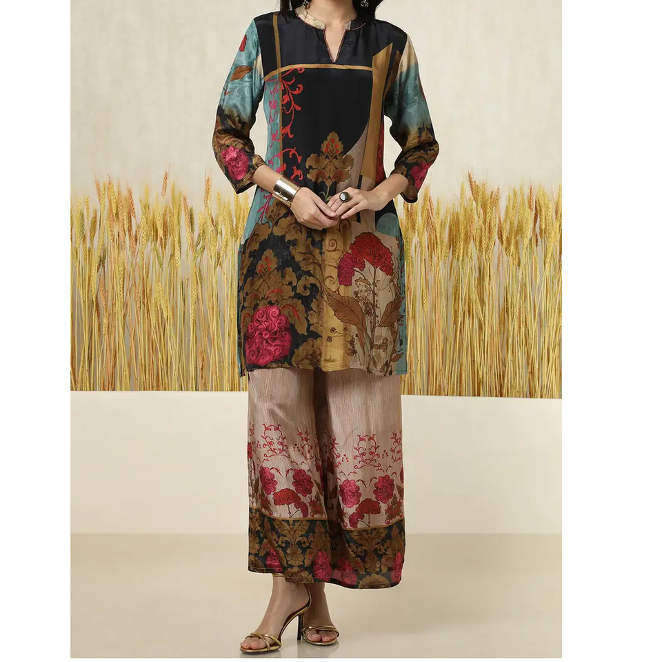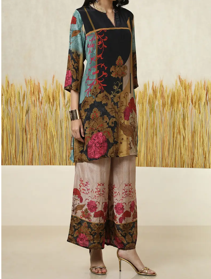 เสื้อผ้าอินเดียและปากีสถานหลากสีทรงตรงพร้อมกางเกงพาลาซโซสีเบจและดีไซน์เนอร์ชุดพิมพ์ลายดอกไม้