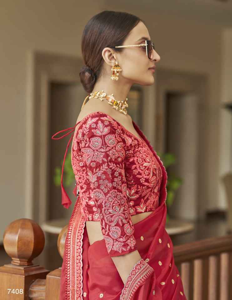 Heavy Rangoli ผ้าไหมเลื่อม Embroiderydery Saree เสื้อสีแดง
