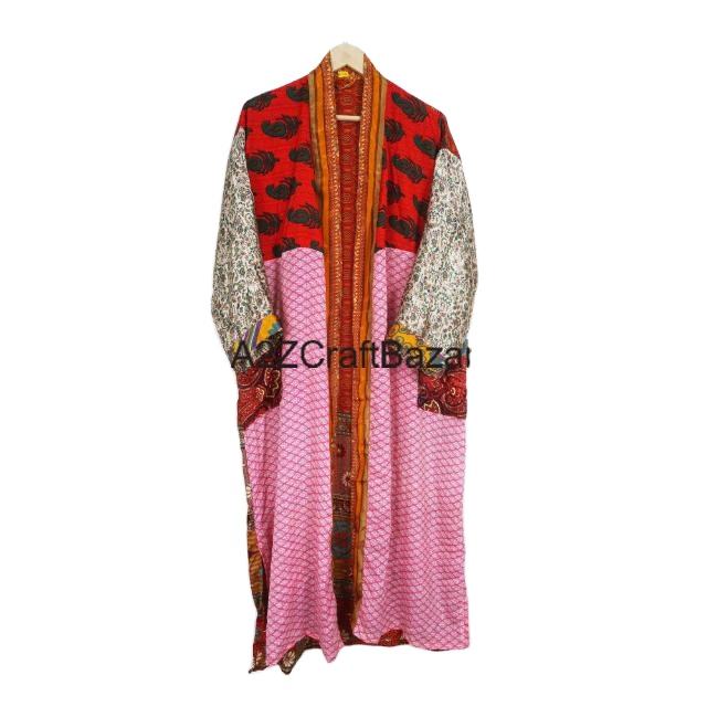 ชุดคลุมคนท้องผ้าไหมสไตล์วินเทจแบบอินเดียชุดกิโมโนยาวเต็มตัวปิดด้วยเชือกผูกคอวีเย็บปะติดด้านหน้า
