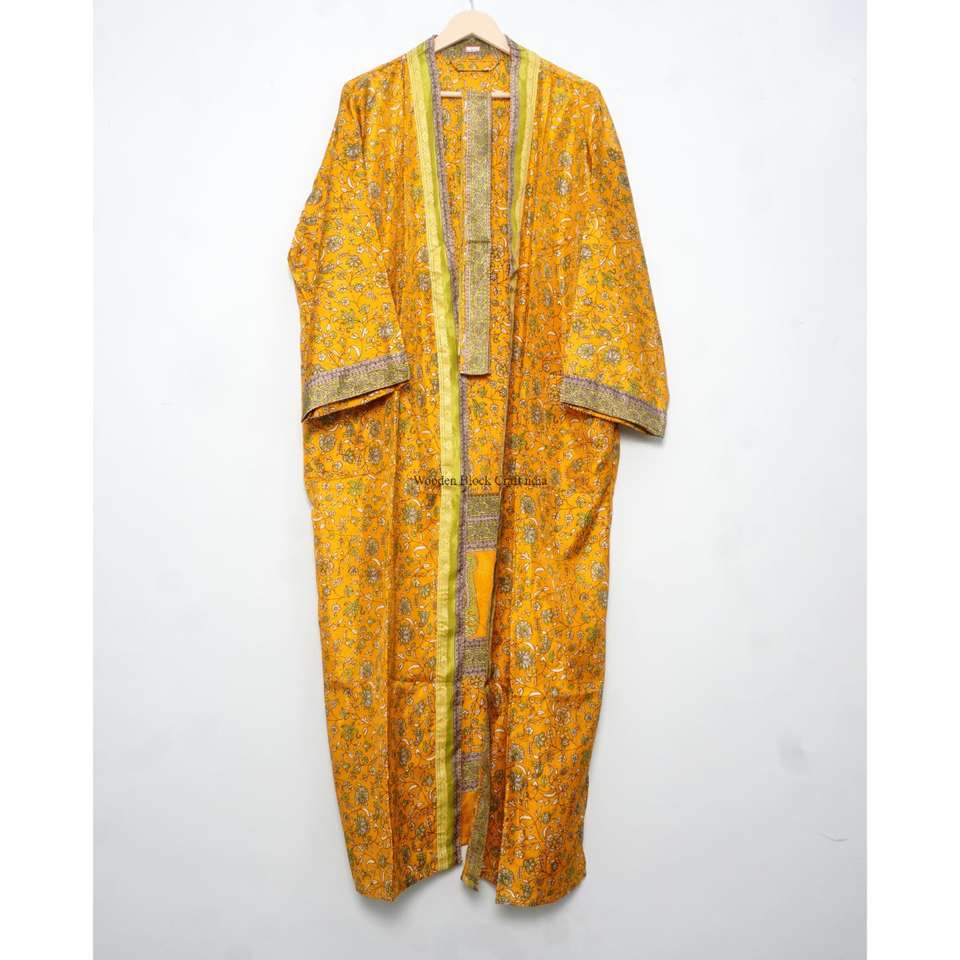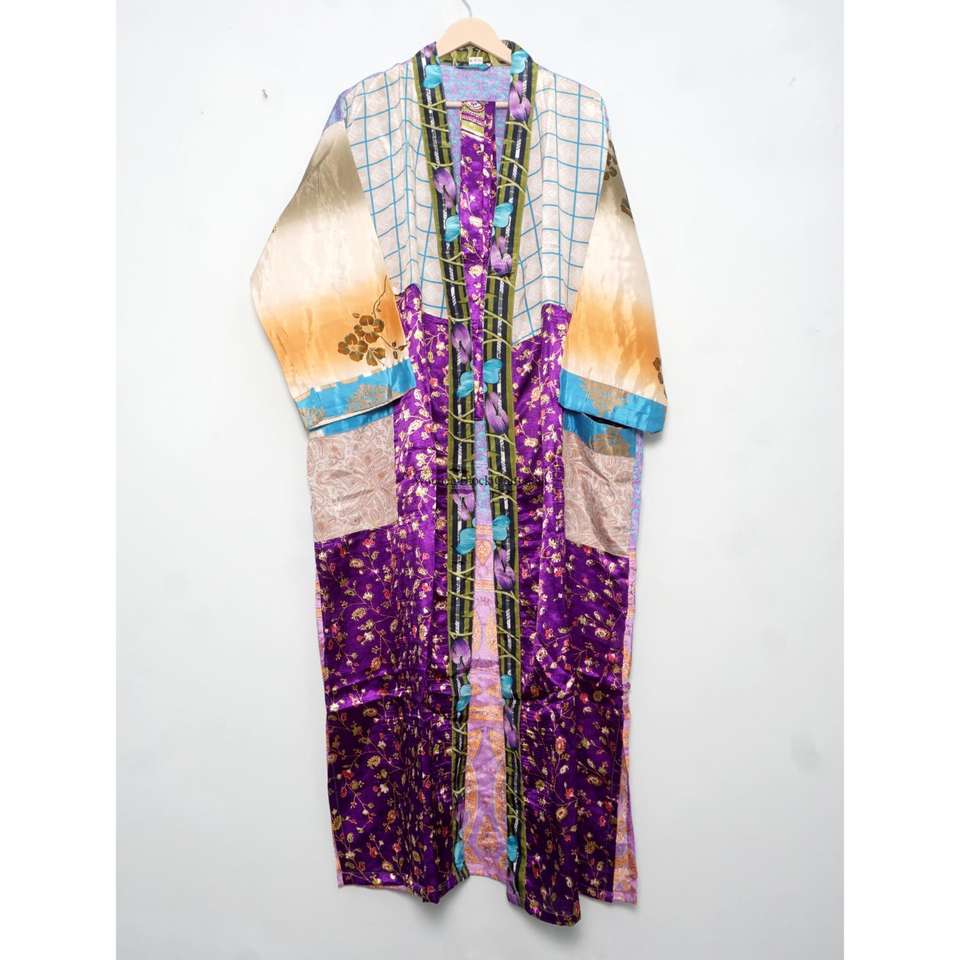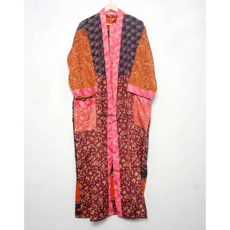 Indian Pure Assorted Silk Japanese Kimono Women's Elegant Summer Nightgown-V-neck Drawstring Closure Full Length Long Sleeves