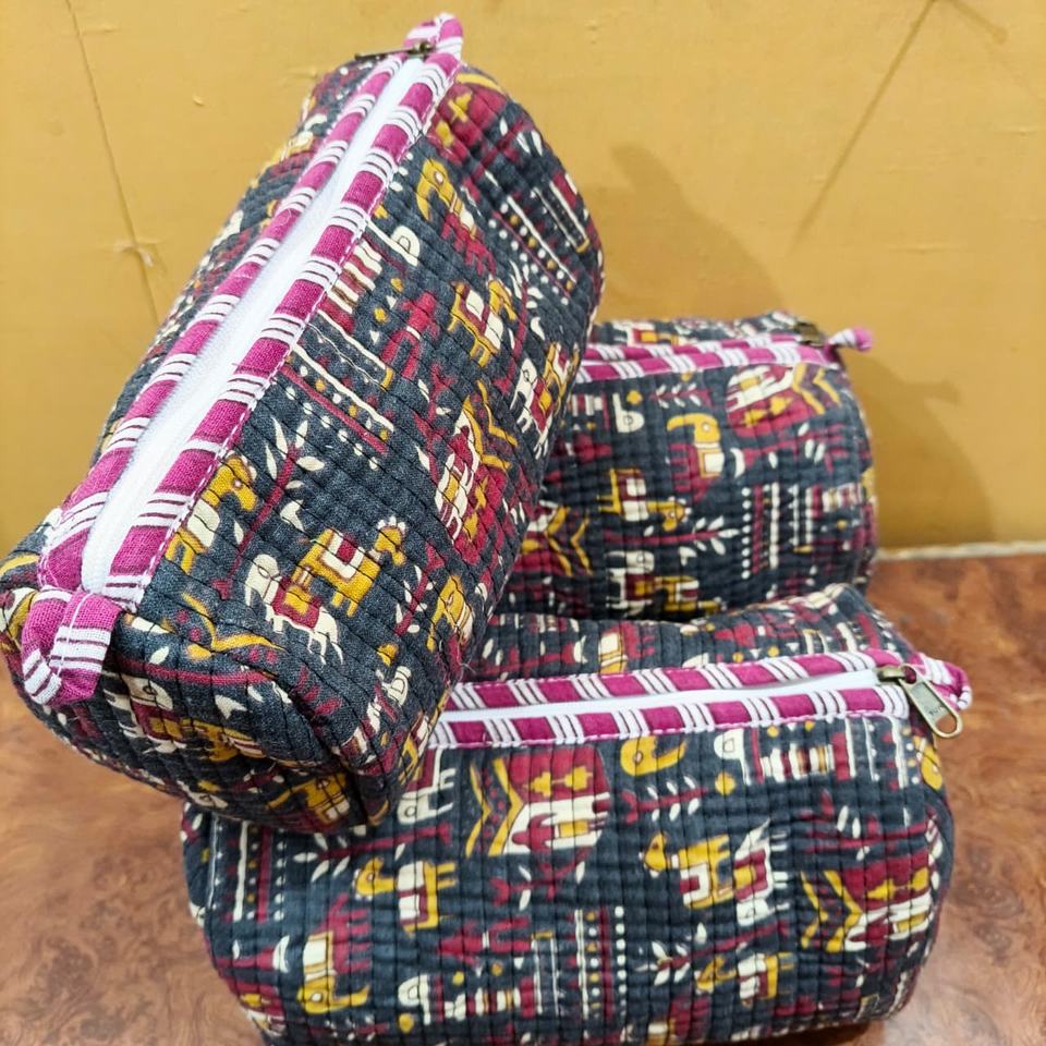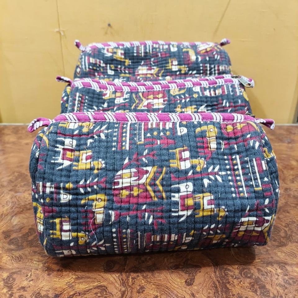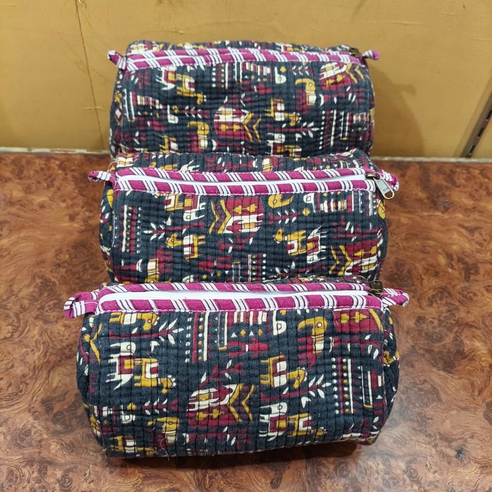 กระเป๋าเครื่องสำอางกันน้ำขนาดใหญ่ลายพิมพ์บล็อกทำมือแบบอินเดีย ผ้าฝ้ายควิลท์ เป็นมิตรกับสิ่งแวดล้อม ชุดสามชิ้น สำหรับฤดูใบไม้ผลิและฤดูหนาว