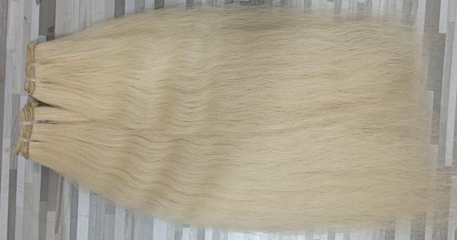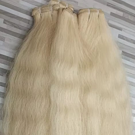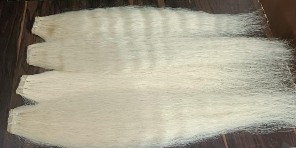 ผมต่อสีบลอนด์บริสุทธิ์จากอินเดียแบบเส้นเดียวมีปลายหนากว่าผ่านกระบวนการทางเคมีฟอกสีผมแบบผู้บริจาคเดี่ยวจำนวนมาก