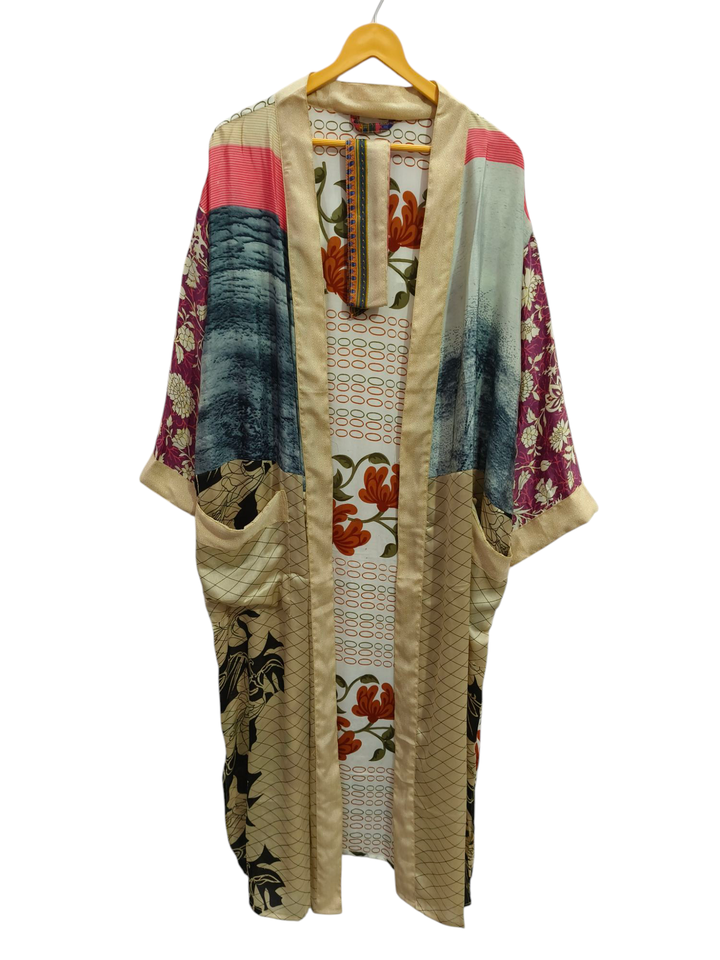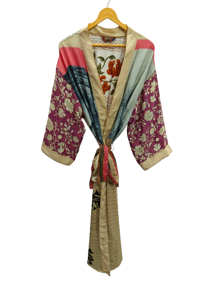 ชุดกิโมโนผ้าไหมส่าหรีลายดอกไม้แนววินเทจชุดคลุมส่าหรีชุดปาร์ตี้ชายหาดผ้านุ่มทำมือสไตล์อินเดีย