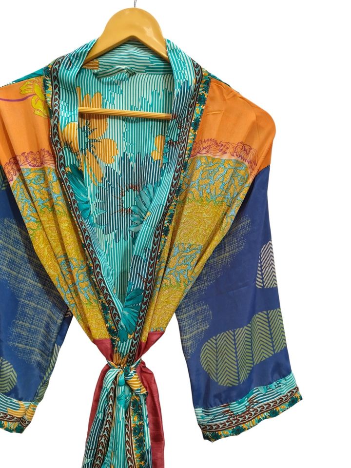 ชุดคลุมกิโมโนผ้าไหมอินเดียแบบแพทช์เวิร์ค ชุดคลุมบิกินี่ ชุดนอน ชุดคลุมยาว งานแฮนด์เมด ผ้าไหมอินเดียวินเทจ รีไซเคิลจากผ้าส่าหรี