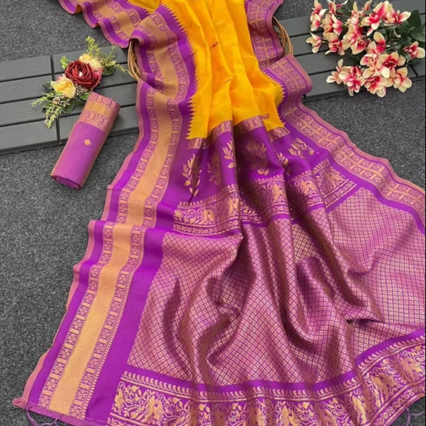 เสื้อไหมไหมซาริสีเหลืองทองจากนักออกแบบชาวอินเดียเสื้อเบลาส์แฟนซีสุดพิเศษแบบดั้งเดิมสำหรับเจ้าสาวในงานแต่งงาน