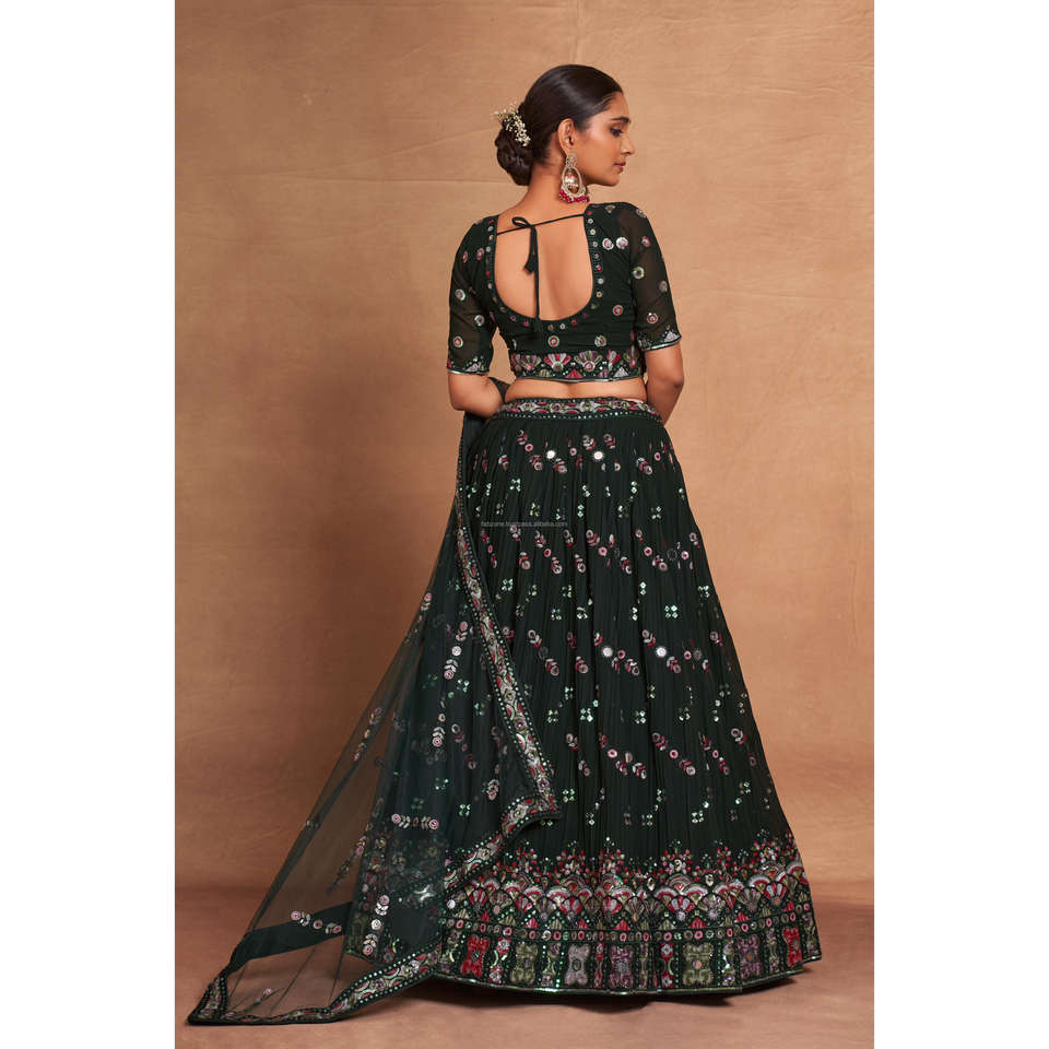 ชุดเลเฮนกา โจลี ผ้ามัสลินสไตล์อินเดีย พิมพ์ลายดิจิทัล ประดับงานกระจกแท้ พร้อมขอบลูกไม้หนัก สำเร็จรูป ผลิตโดย แมนูฟา
