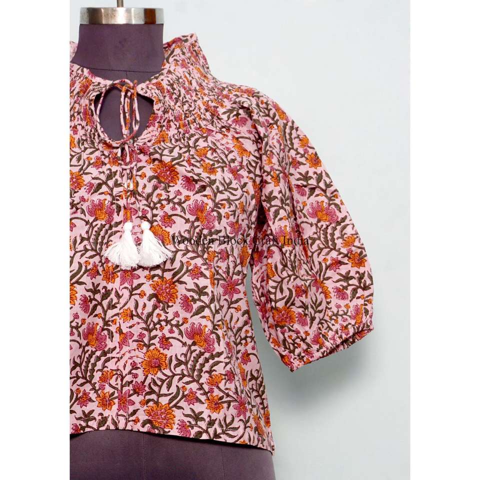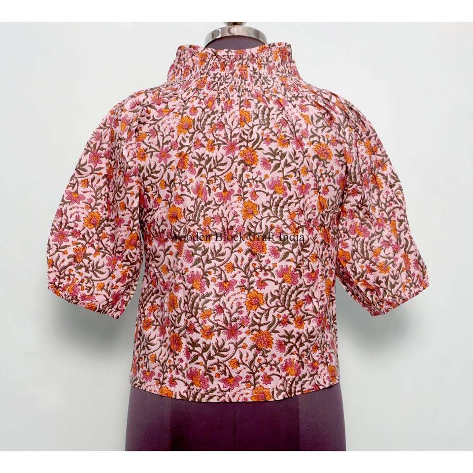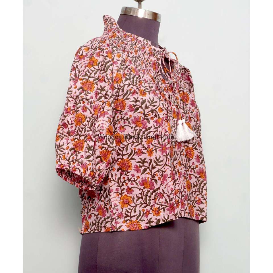 Indian Style Vintage Summer Shirt 100% Cotton Floral Digital Print O-Neck puff Sleeves Eco-Friendly Breathable Crop Top Women's