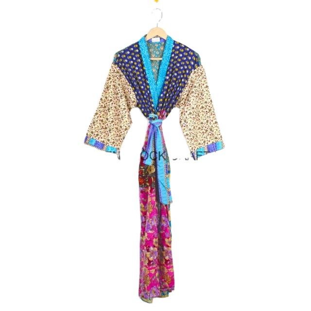 Handmade Indian Style Satin patchwork Women's kimono robe V-neckline with simple design and floral print for night casual wear
