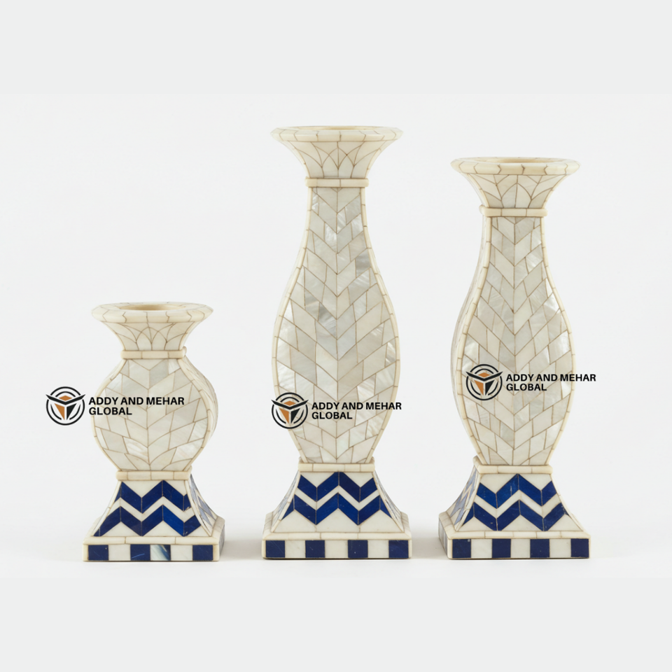 ที่ตั้งเทียนไข่มุกแบบเรียวสุดหรูฐานเรขาคณิตสีฟ้าและสีขาวลายดอกไม้/ใบไม้ผู้จำหน่ายอินเดีย