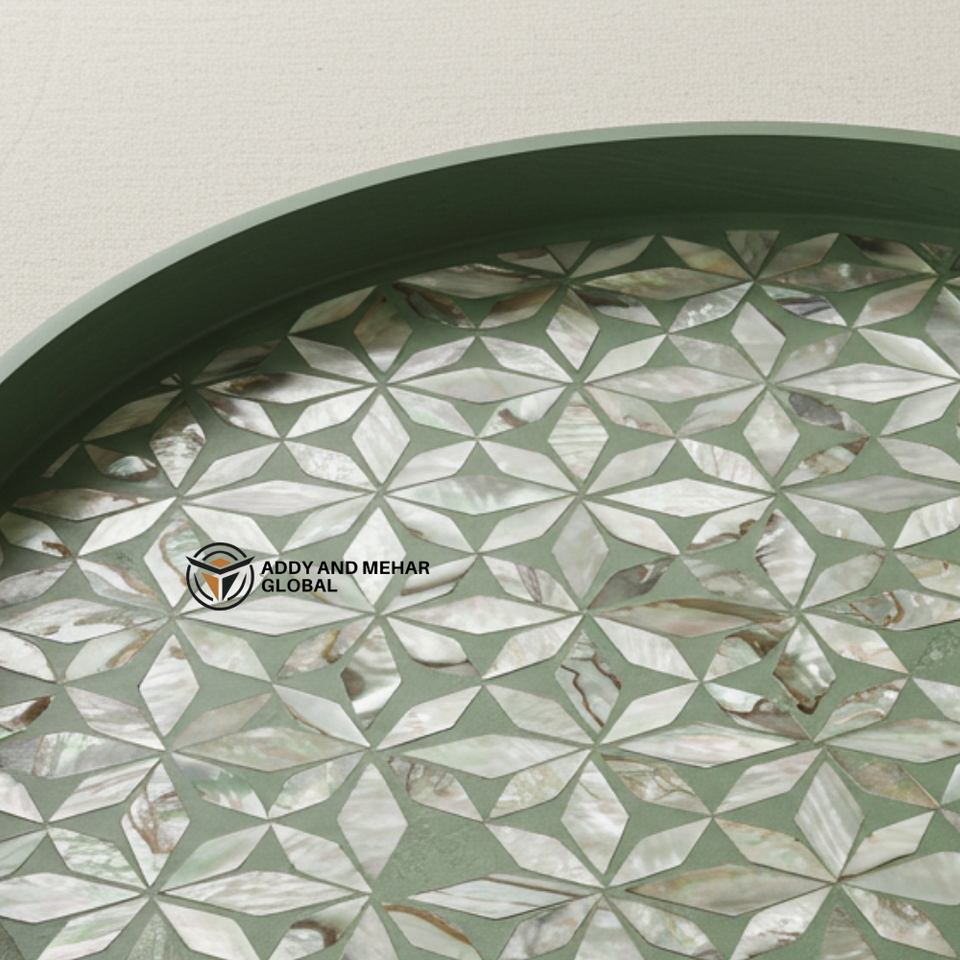 ถาดเสิร์ฟทรงสี่เหลี่ยมสีเขียว/สีรุ้ง, ที่จับรูปใบไม้สีทองทำจากมุก (ม็อบ) หรูหราผู้จัดจำหน่ายในอินเดีย